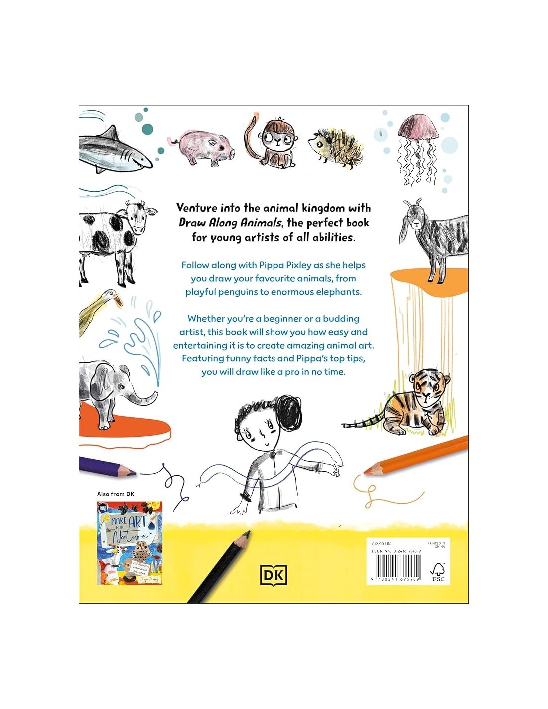 Simple draw-along steps that are straightforward and sketchy, making it easy for children to follow along. Tips on how to use different natural materials and techniques they can use to improve their skills. With Pippa Pixley’s Draw Along, little ones will be creating masterpieces in no time! From cheeky chickens to sleepy sloths, and brilliant bugs to little lambs, whatever your favourite animal is, Pippa can teach you how to draw it! Perfect for young artists of all ages, whether learning to draw for the first time or refining more advanced skills, this book has something for everyone.